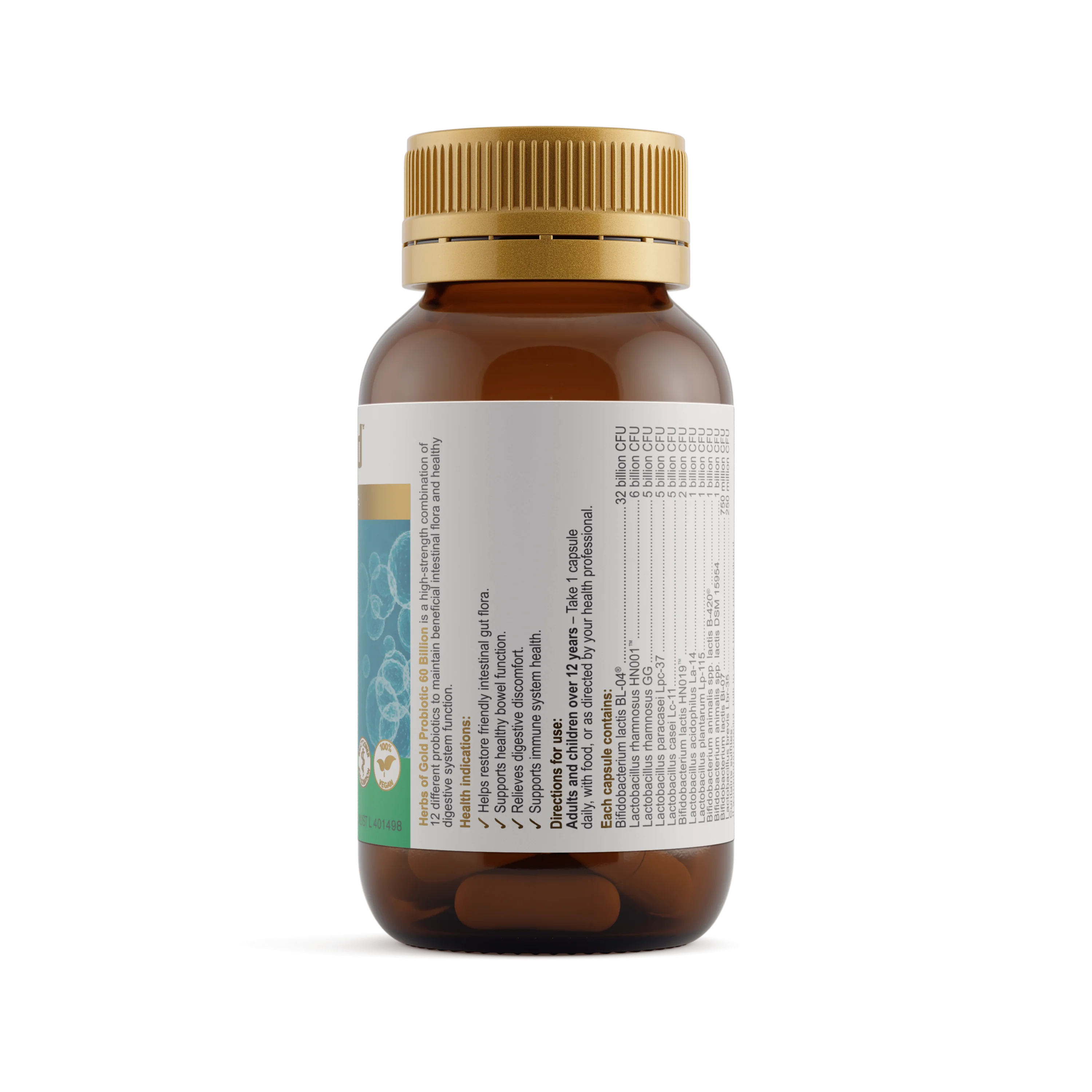 Herbs of Gold Probiotic 60 Billion is a high-strength combination of 12 different probiotics to maintain beneficial intestinal flora and healthy digestive system function.