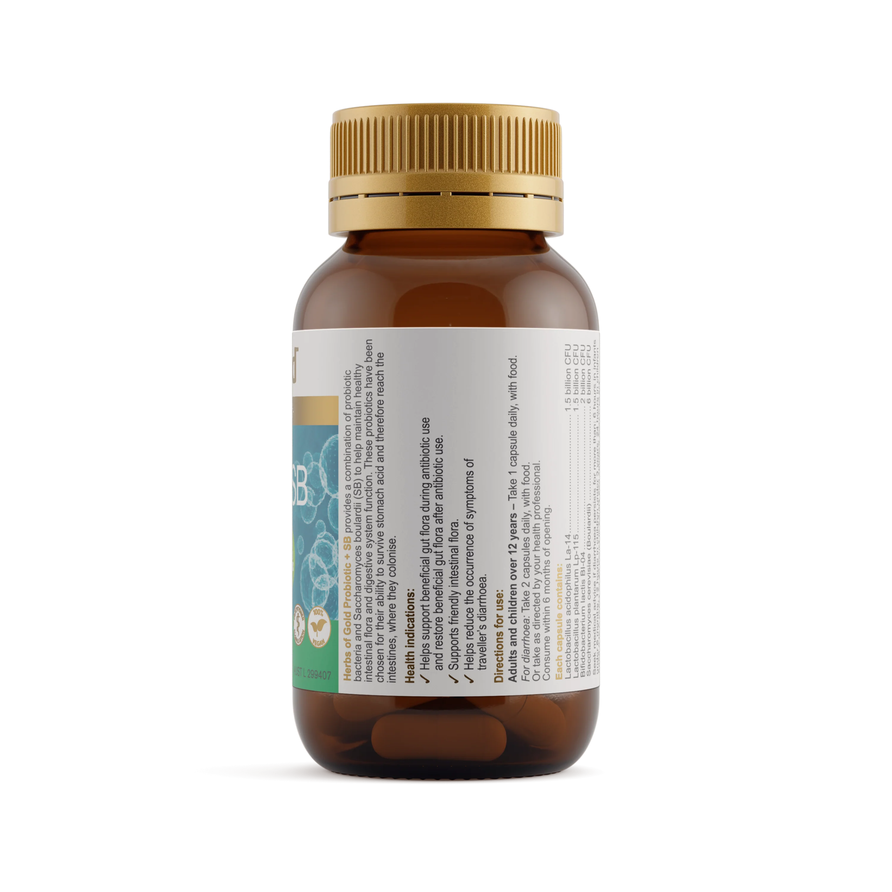 Herbs of Gold Probiotic + SB is a probiotic complex containing Saccharomyces boulardii (SB) to support beneficial intestinal flora.