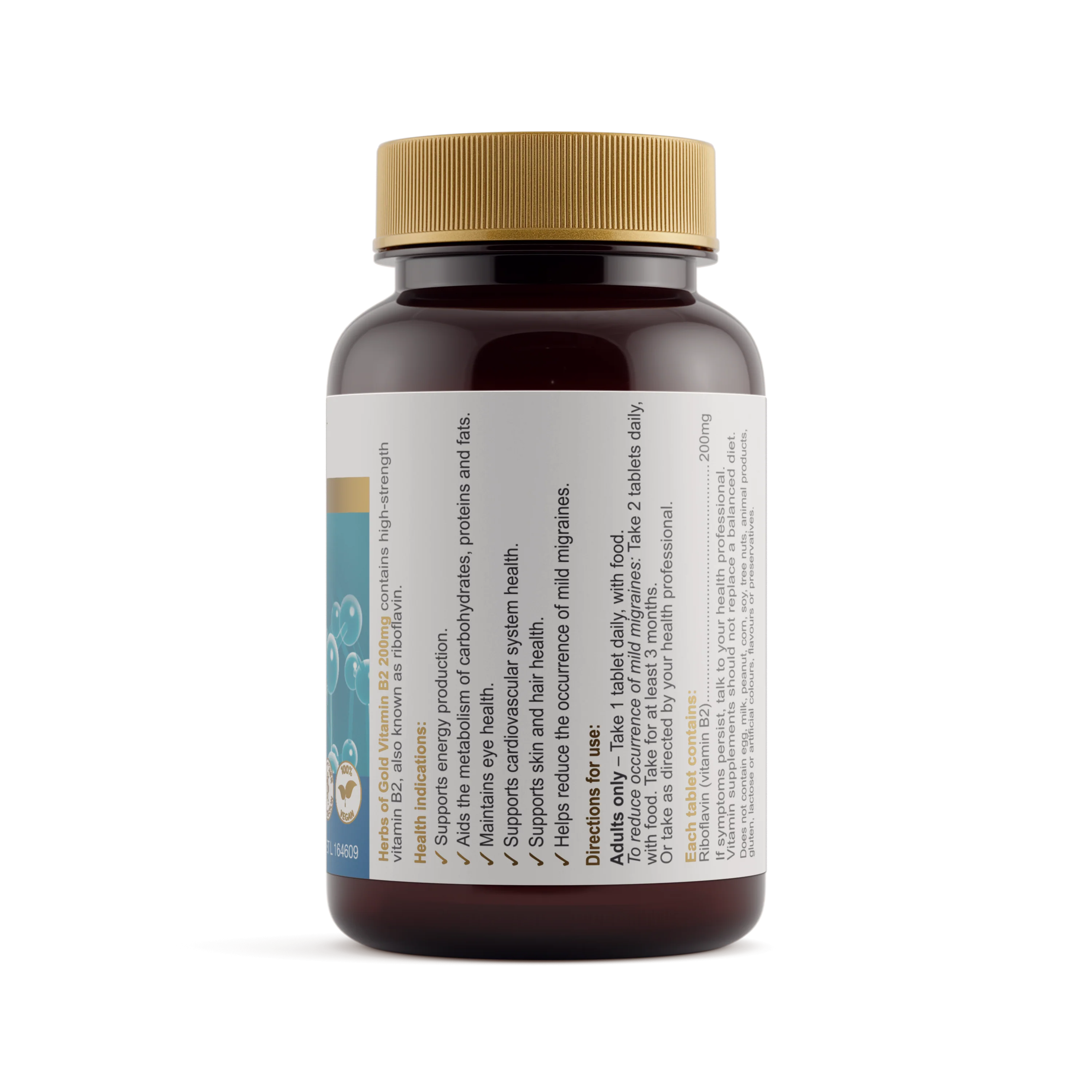 Herbs of Gold Vitamin B2 200mg contains high-strength vitamin B2, also known as riboflavin, to help support vitamin B2 levels in the body.