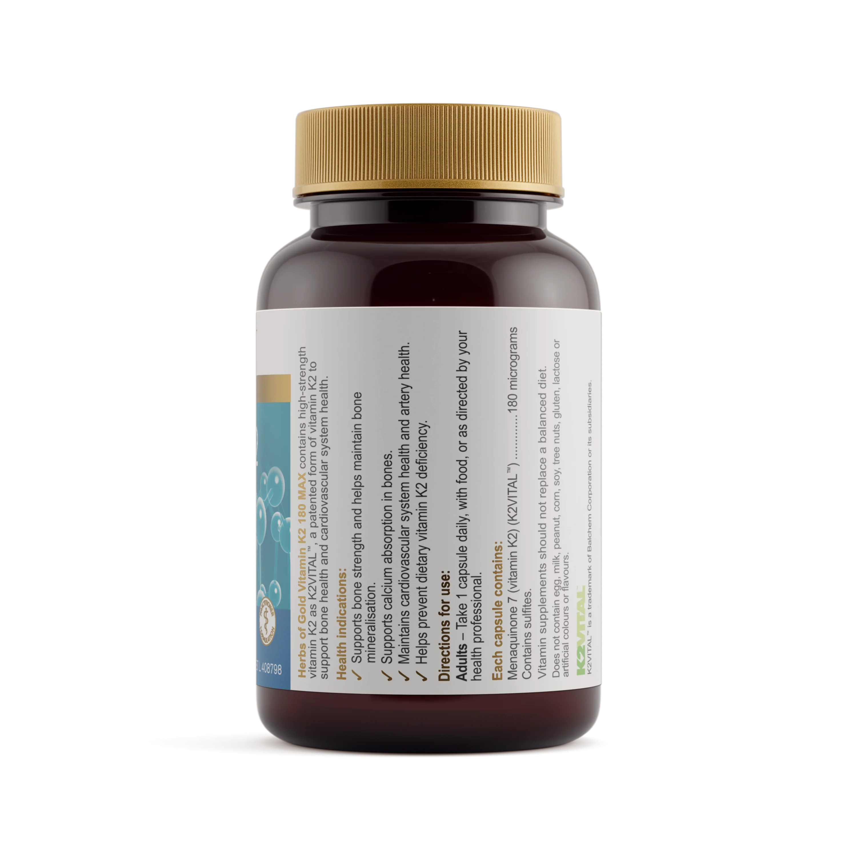 Herbs of Gold Vitamin K2 180 MAX contains vitamin K2 (menaquinone 7) as K2VITAL™, a high-quality, patented form of vitamin K2.